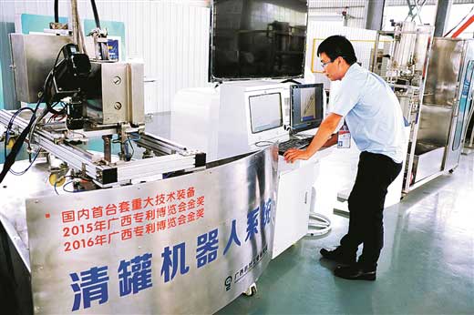 打造首臺套高壓清洗機器人。2014年底,高壓清洗機器人系統(tǒng)在廣西上上糖業(yè)有限公司正式投入榨季運行,標志著高壓清洗機器人系統(tǒng)研發(fā)成果順利實現(xiàn)產業(yè)化推廣。該系統(tǒng)是完全自主研發(fā),共獲21項專利(其中發(fā)明專利5項),獲廣西專利博覽會金獎專利2項,并于2015年獲得自治區(qū)工信委國內首臺(套)重大技術裝備認定,2018年獲得廣西創(chuàng)新發(fā)展驅動(重大)專項支持。高壓清洗機器人系統(tǒng)是面向國內外制糖、輕工、食品、化工、制藥等行業(yè),在狹小受限空間、高溫潮濕環(huán)境下,代替人工清洗加熱管機構的機器人,屬世界首創(chuàng),達到代替?zhèn)鹘y(tǒng)人工作業(yè)方式、減少人員傷亡、提高安全生產率和提升清洗質量的效果。目前,該系統(tǒng)已在廣西、云南、新疆等主要制糖產區(qū)企業(yè)大量應用,并出口泰國、越南、緬甸等國家,受到海外客戶高度認可,打造了廣西制糖智能裝備的優(yōu)質品牌。