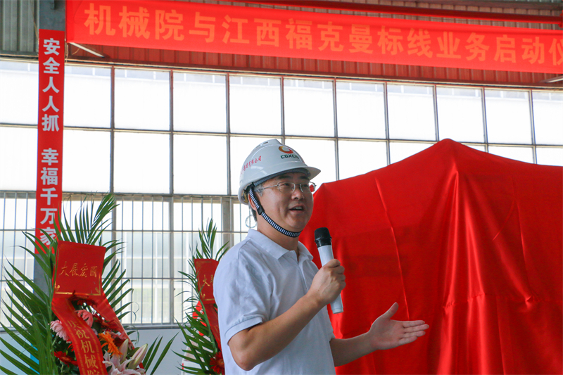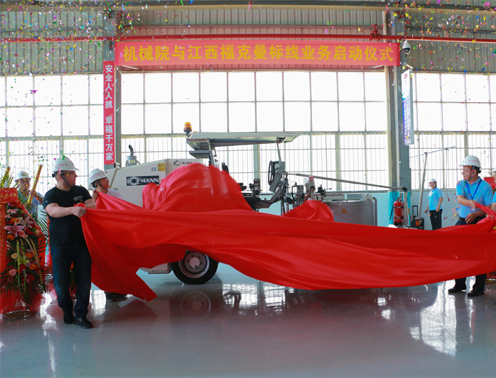 機(jī)械院黨委書記、董事長、總經(jīng)理王吉才和福克曼公司總經(jīng)理張磊等人在機(jī)械院第二車間為全自動(dòng)熱熔標(biāo)線機(jī)揭幕,機(jī)械院領(lǐng)導(dǎo)班子成員、機(jī)電工程公司全體員工參加儀式。