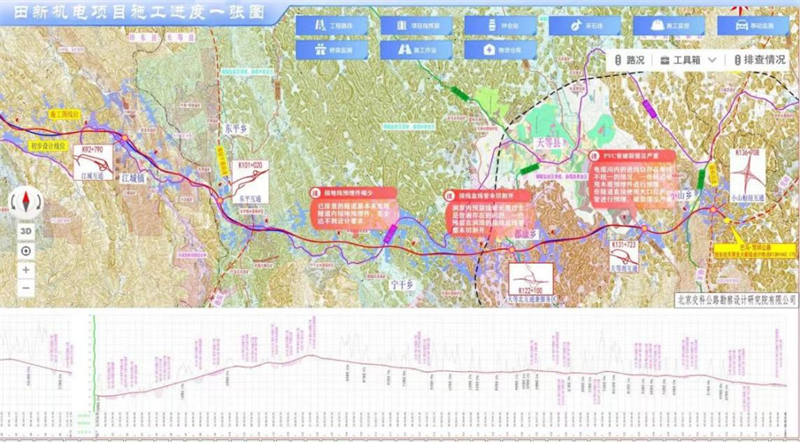 團(tuán)隊(duì)還自主研發(fā)并啟用田新機(jī)電項(xiàng)目工程信息管理系統(tǒng),該系統(tǒng)可實(shí)現(xiàn)工程信息可視化、過程管理信息化、工程管控智能化,形成“施工進(jìn)度一張圖”,可以直觀地展現(xiàn)田新路整體施工情況,極大地優(yōu)化了施工人員及車輛、安全隱患情況、質(zhì)量管理、進(jìn)度管理、變更情況的管理,提升了項(xiàng)目部對施工的管控力度,做到了危險(xiǎn)源精準(zhǔn)識別管控,保障了項(xiàng)目施工的安全平穩(wěn)運(yùn)行,同時(shí)為人力資源調(diào)配、設(shè)備物資采購及調(diào)撥提供了極大參考價(jià)值。