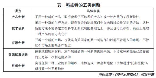 在熊彼特看來,創(chuàng)新包括五種情況,分別為產(chǎn)品創(chuàng)新、技術(shù)創(chuàng)新、市場創(chuàng)新、資源配置創(chuàng)新與組織創(chuàng)新,具體如下表:
