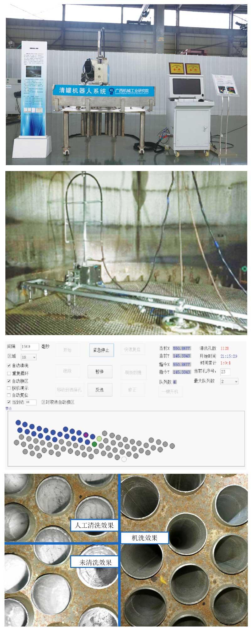 我院與廣西上上糖業(yè)有限公司合作開發(fā)的全自動高壓清洗機器人系統,面向國內外制糖、輕工、食品、化工、制藥等行業(yè),在狹小受限空間、高溫潮濕環(huán)境下,代替人工清洗加熱管積垢,屬世界首創(chuàng),達到代替?zhèn)鹘y人工作業(yè)方式、減少人員傷亡、提高安全生產率和提升清洗質量的目的。