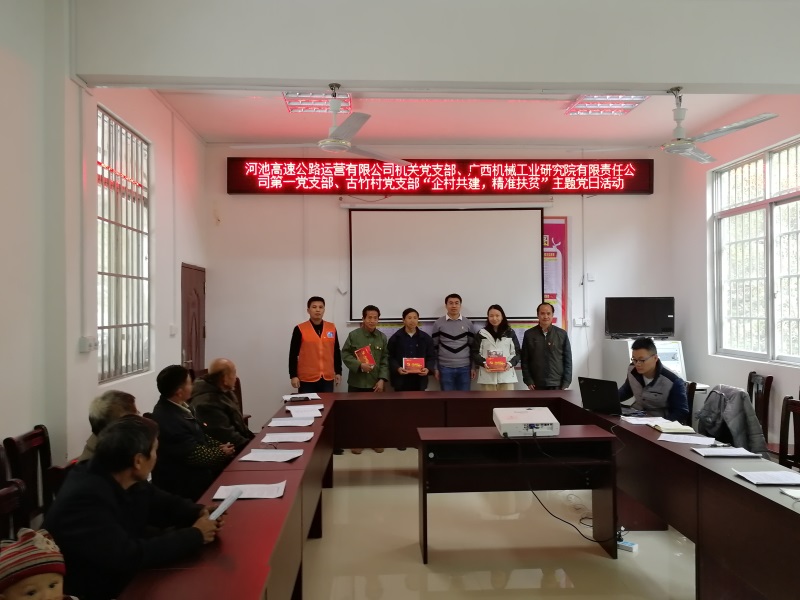 為激發(fā)支部黨建工作新活力,錘煉提升企業(yè)黨員黨性修養(yǎng),強化黨建引領,助力脫貧攻堅,推動黨建工作與扶貧工作相互促進。11月28日,廣西機械工業(yè)研究院有限責任公司第一黨支部前往大化縣扶貧點七百弄鄉(xiāng)古竹村,與河池高速公路運營有限公司機關(guān)黨支部、古竹村黨支部聯(lián)合開展“企村共建,精準扶貧”主題黨日活動。