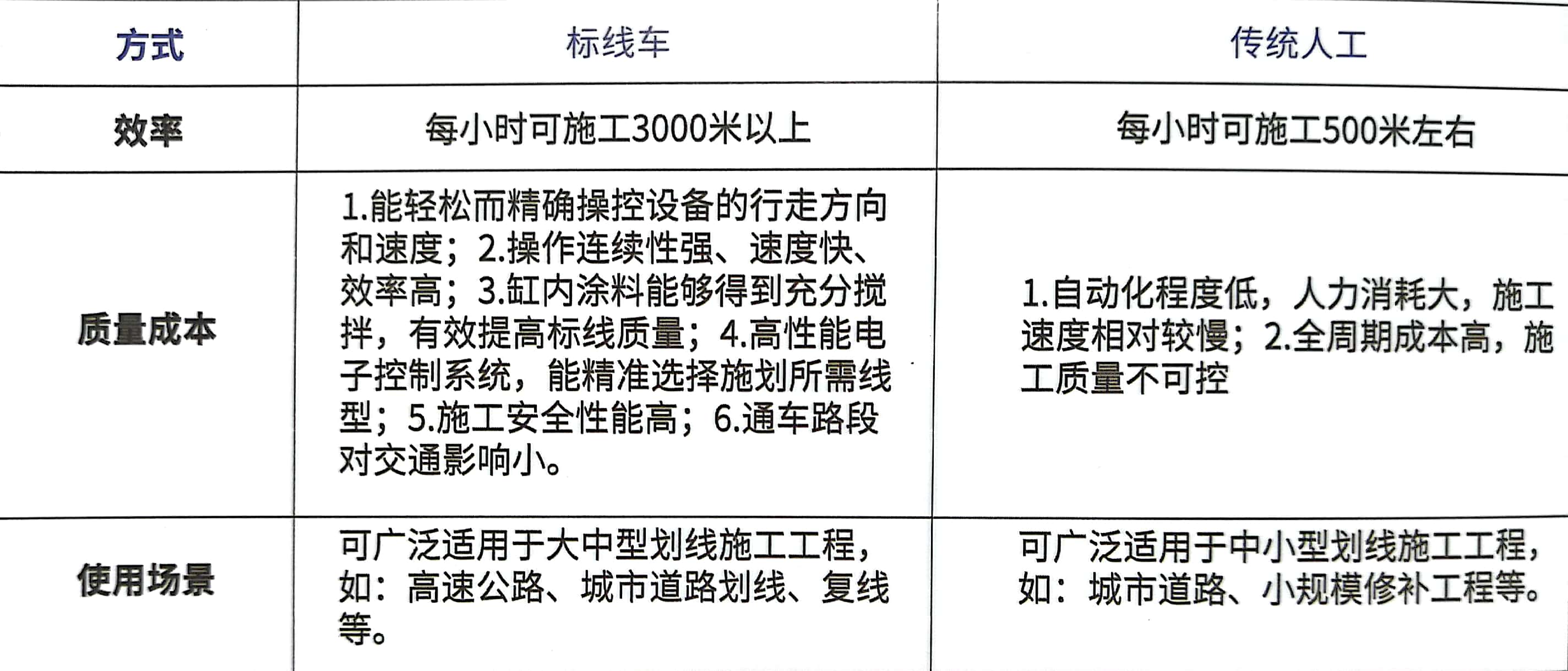 全自動(dòng)熱熔標(biāo)線機(jī)廣泛適用于大中型劃線施工工程,如高速公路、城市道路劃線等,智能化、自動(dòng)化程度高,每小時(shí)可施工3000米以上,極大程度提升了標(biāo)線施工的規(guī)范性、安全性和高效性。設(shè)備可以使用各種標(biāo)線系統(tǒng)的涂料,可噴涂、可刮涂雙組份膠體涂料和可刮涂熱塑性材料。每日產(chǎn)出量高達(dá)6000平方米,智能化控制可一鍵切換:結(jié)構(gòu)標(biāo)線、普通標(biāo)線、雙線及虛線施劃,內(nèi)置的電控系統(tǒng)保證項(xiàng)目段作業(yè)標(biāo)線品質(zhì)穩(wěn)定一致,熱油導(dǎo)熱料倉出料恒溫,保證熱熔涂料溫度均勻合理,全自動(dòng)化操作只需一人即可輕松操作設(shè)備,施工效率為人工繪制的6倍,大大降低施工成本。