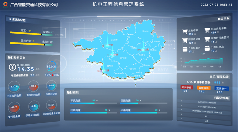 團(tuán)隊(duì)還自主研發(fā)并啟用田新機(jī)電項(xiàng)目工程信息管理系統(tǒng),該系統(tǒng)可實(shí)現(xiàn)工程信息可視化、過程管理信息化、工程管控智能化,形成“施工進(jìn)度一張圖”,可以直觀地展現(xiàn)田新路整體施工情況,極大地優(yōu)化了施工人員及車輛、安全隱患情況、質(zhì)量管理、進(jìn)度管理、變更情況的管理,提升了項(xiàng)目部對施工的管控力度,做到了危險(xiǎn)源精準(zhǔn)識別管控,保障了項(xiàng)目施工的安全平穩(wěn)運(yùn)行,同時(shí)為人力資源調(diào)配、設(shè)備物資采購及調(diào)撥提供了極大參考價(jià)值。