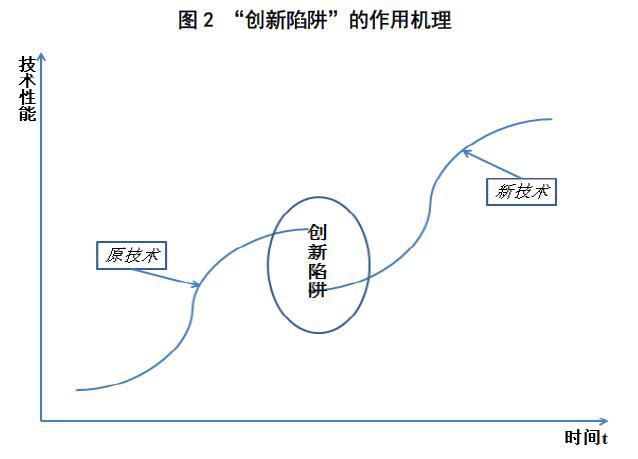 “創(chuàng)新陷阱”正是產(chǎn)生于這種新舊技術(shù)的更替過程中(參見圖2)。具體來說,對于一家企業(yè),從原有技術(shù)軌道跨向新技術(shù)軌道是一件不容易的事情;企業(yè)越是在自己原有的技術(shù)專長上加以創(chuàng)新,便會在原有技術(shù)軌道上走得越遠(yuǎn);也正因為如此,企業(yè)也便越會延滯進入新的技術(shù)軌道,進而也越來越遭受舊技術(shù)極限的扼制。