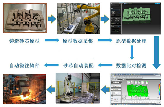 產(chǎn)品質(zhì)量檢測是企業(yè)生產(chǎn)現(xiàn)場在線工作模式,是一個(gè)生產(chǎn)線的工位,對測量設(shè)備精度和功能的要求遠(yuǎn)超過反求設(shè)計(jì)。因此,該檢測系統(tǒng)可無縫應(yīng)用于產(chǎn)品質(zhì)量在線檢測,如鑄造、鍛壓及注塑等生產(chǎn)線上的鑄件、鍛件、沖壓件、注塑件等復(fù)雜曲面產(chǎn)品檢測,“一鍵式”全自動(dòng)完成掃描檢測流程,保證最佳的測量精度和速度,實(shí)現(xiàn)質(zhì)量控制(QC)與部件生產(chǎn)環(huán)節(jié)緊密結(jié)合。主要技術(shù)包括: